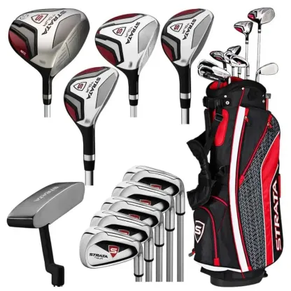 LLAWAY STRATA FULL SET The Strata Set is designed to give you maximum performance right out of the box for more confidence from tee-to-green. The lightweight 460cc forged driver fairway wood hybrid irons and putter make up a set that provides a great combination of distance forgiveness and control and is very easy to hit. Driver – A lightweight 460cc forged driver that has a large sweet spot a titanium head and provides more forgiveness to help you hit it farther off the tee. (Headcover included) Fairway Wood – This oversized fairway wood is very forgiving and has a more aerodynamic head shape for long high flying shots. (Headcover included) Hybrid – A great alternative to difficult long irons that gives you more confidence on a variety of shots. Irons 6-PW – These stainless steel irons offer a great combination of forgiveness and control. Putter – A mallet putter with alignment to help give you incredible accuracy. Stand Bag – A lightweight and durable stand bag that comes with five convenient pockets an additional cooler pocket a rain hood and a backpack strap system.